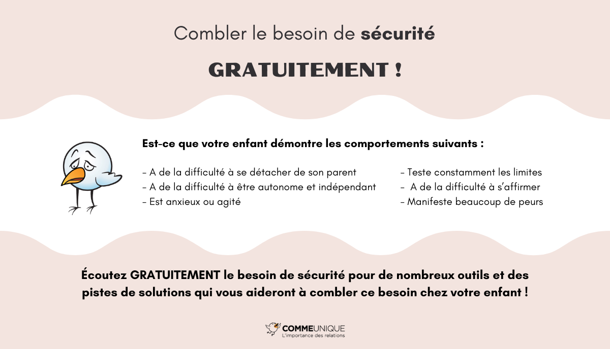 Dans le cadre de la semaine de l’engagement parental, on vous offre d’écouter gratuitement le besoin de sécurité qui fait partie de notre formation complète “Les comportements dérangeants, un langage à décoder !”